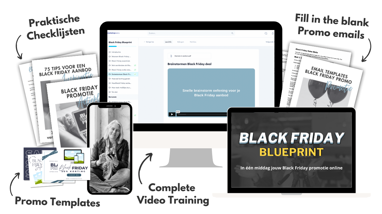 Klaar voor een uitverkochte Black Friday lancering zonder stress, frustratie of gedoe? Met de bondige videolessen & handige-fill-in-the-blank mail templates heb je jouw Black Friday actie in één middag klaar en zie vervolgens de bestellingen vanzelf binnenkomen.